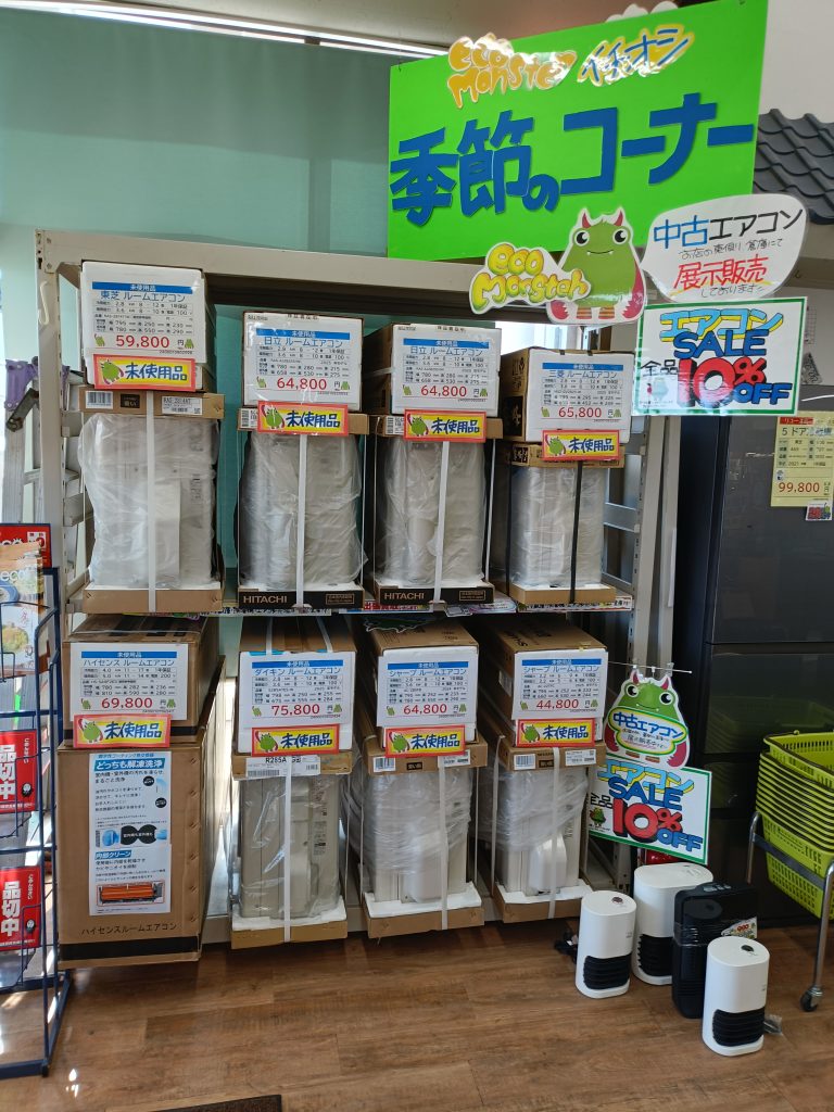 ご覧いただきありがとうございます。 もうすぐ夏本番となりますが、すでに真夏日を超える日が続いていますね…。 エコモンスターでは、中古品のほか、アウトレット品のエアコンやサーキュレーター、扇風機も販売しております!